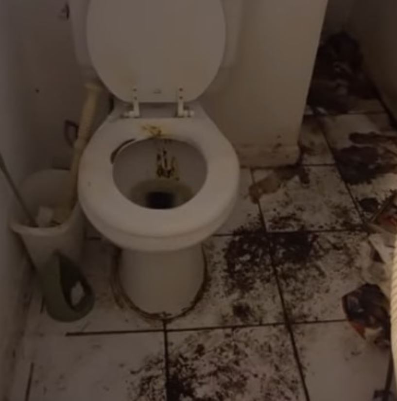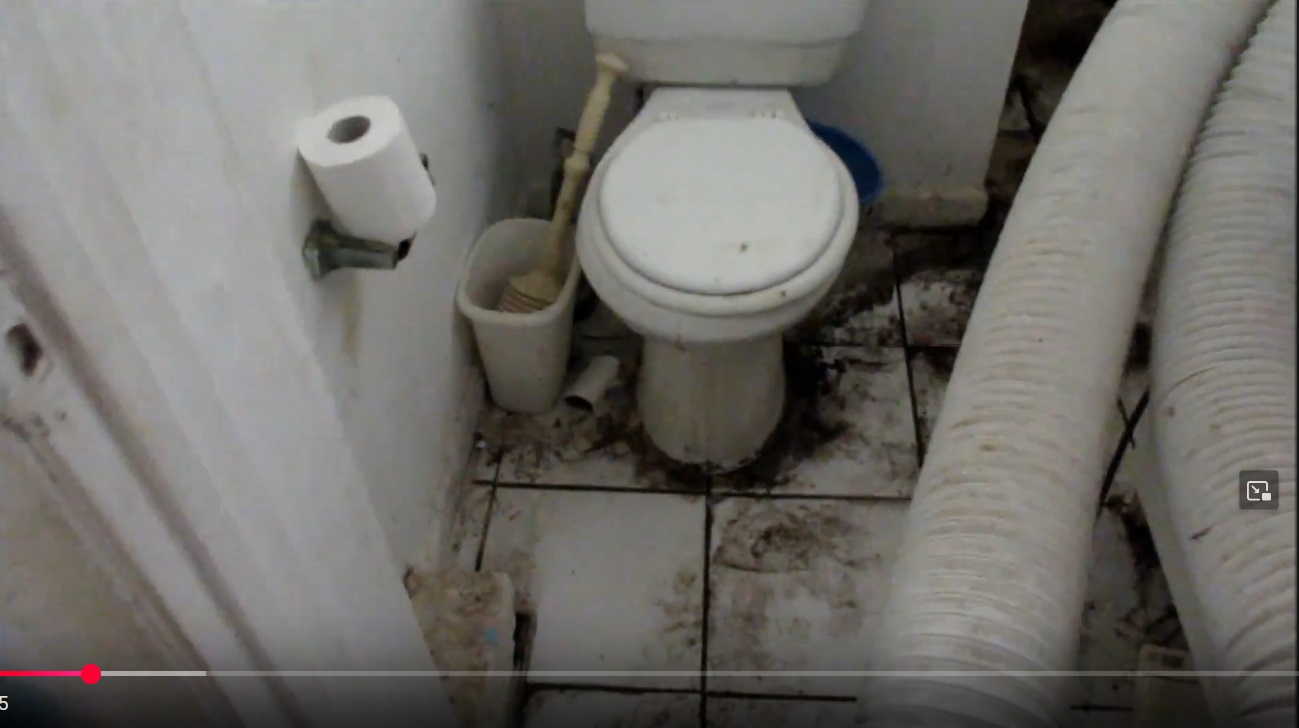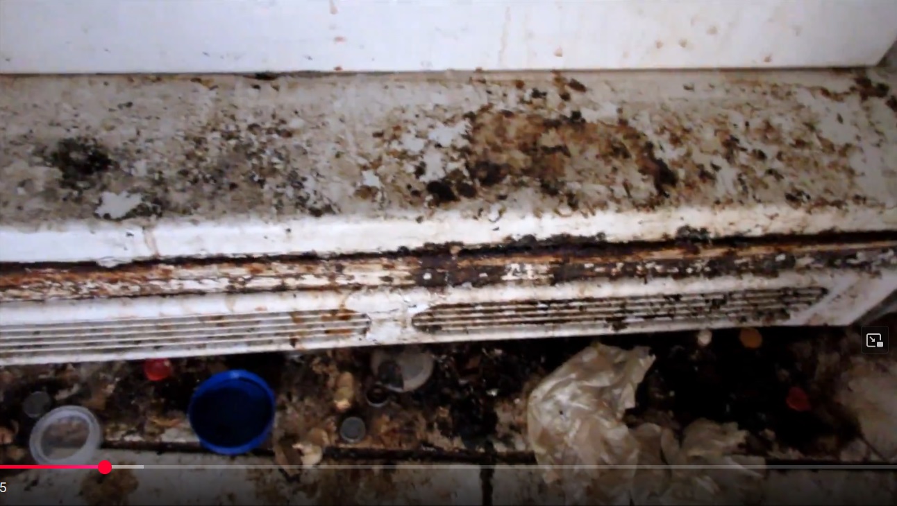 My lay opinion regarding the black dirt on the floor is, besides of course trash, dirt from the outside, shit, …are the moldy fluids from his mobile AC unit.