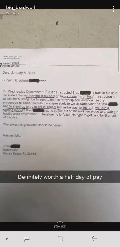 I gotta give their Union credit: seems Brad isn’t well liked at the post office and keeps his job anyway. It sick it piss.