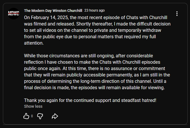 Apologies for the McCuck shilling fans, but he unprivated his videos yesterday. I only mention it because he, as I’m sure you know, previously hid all of the videos on his channel and made a very long, very gay post about being harassed or something. That post has since been deleted from his Youtube page, and he’s put up this new one and restored the videos.