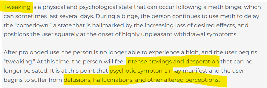 Tweaking is the 4th stage that meth users experience, and is also the most dangerous. The condition occurs when the user has come to the end of a meth binge, and the drug is no longer is providing the user with the desired rush or a high.
